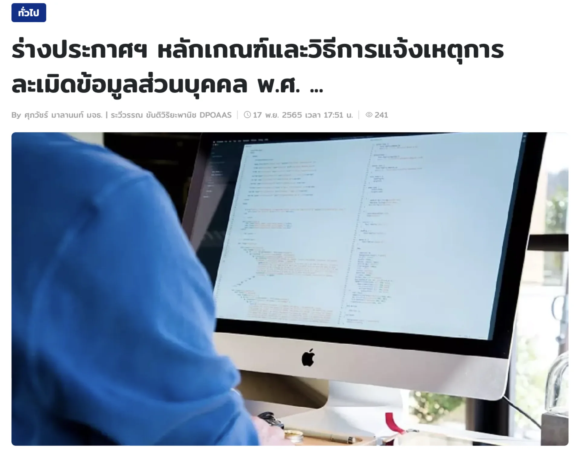 สำนักงานคณะกรรมการคุ้มครองข้อมูลส่วนบุคคลได้เผยแพร่ร่างประกาศคณะกรรมการคุ้มครองข้อมูลส่วนบุคคล เรื่อง หลักเกณฑ์และวิธีการในการแจ้งเหตุการละเมิดข้อมูลส่วนบุคคล พ.ศ. .... (ร่างประกาศฯ) เพื่อให้ผู้มีส่วนได้เสียได้ร่วมแสดงความคิดเห็นร่างกฎหมายลำดับรองภายใต้พ.ร.บ.คุ้มครองข้อมูลส่วนบุคคล พ.ศ. 2562 ระหว่างวันที่ 2 - 20 พฤศจิกายน 2565 โดยสามรถดาวน์โหลดเอกสารและแสดงความคิดเห็นได้ผ่านช่องท่าง http://www.pdpc.or.th