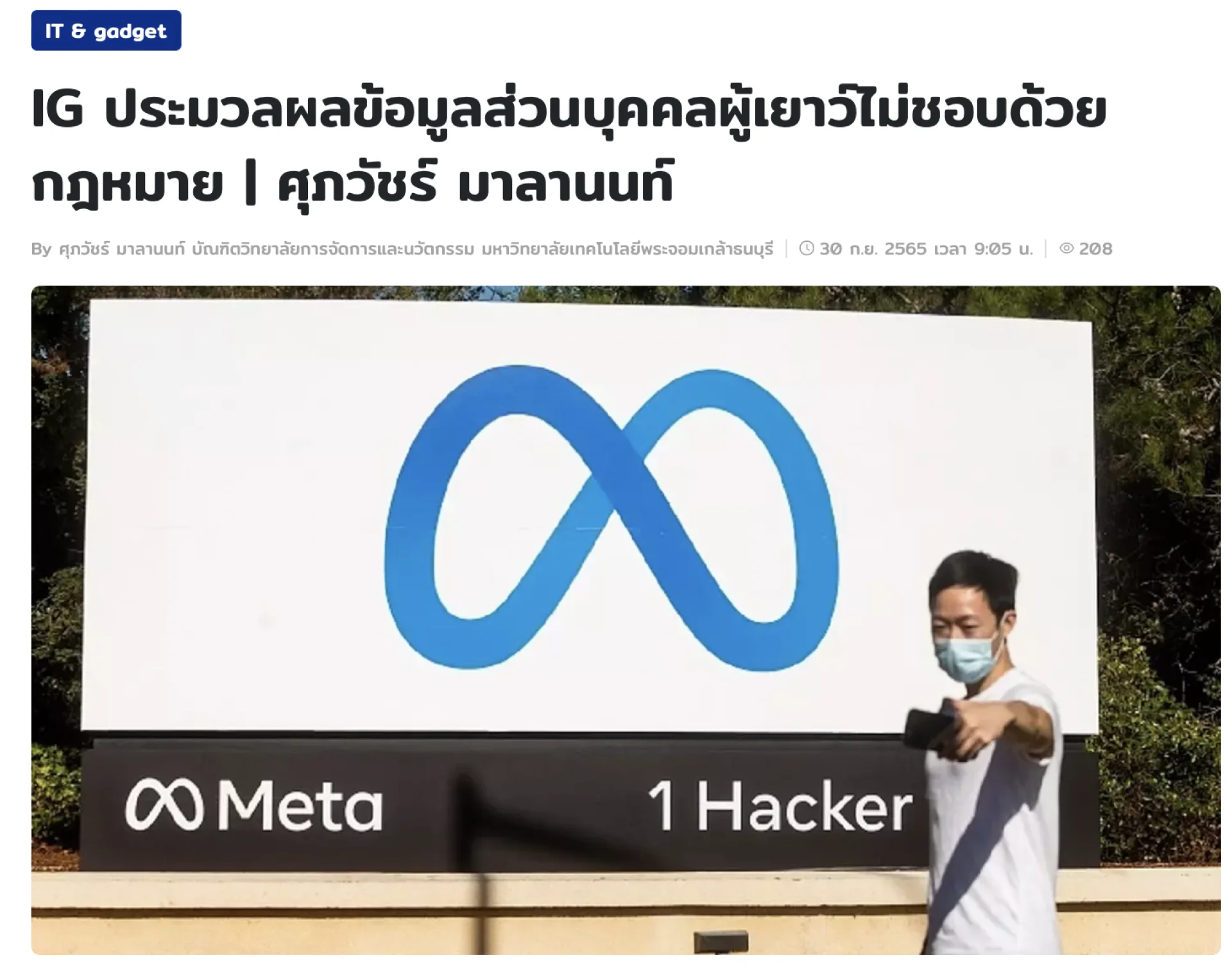 เมื่อวันที่ 15 กันยายน 2565 ที่ผ่านมา Ireland Data Protection Commission (DPC) ได้เผยแพร่คำสั่งลงโทษปรับ Meta Platforms Ireland Limited (Instagram) เป็นเงินรวม 405 ล้านยูโรต่อกรณีการประมวลผลข้อมูลส่วนบุคคลของผู้เยาว์ที่ใช้ Instagram ในสหภาพยุโรปโดยไม่ชอบด้วยกฎหมายคุ้มครองข้อมูลส่วนบุคคลของสหภาพยุโรป หรือ General Data Protection Regulation (GDPR) โดยการไต่สวนการกระทำความผิดดังกล่าวเริ่มต้นขึ้นในวันที่ 21 กันยายน 2563 โดยมี DPC เป็นผู้มีอำนาจหลักในการดำเนินการไต่สวนและกำหนดมาตรการลงโทษ Meta Platforms Ireland Limited เนื่องจากเป็นประเทศที่ถือว่า Meta มีสำนักงานใหญ่ตั้งอยู่ในสภาพยุโรป